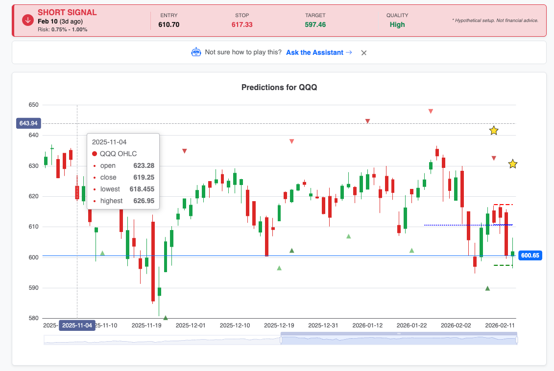 While the broader market was still pumping on momentum, our systematic models flagged a high-quality short entry for $QQQ at 610.70. Within 72 hours, the tape confirmed our data, hitting the target at 600.65.